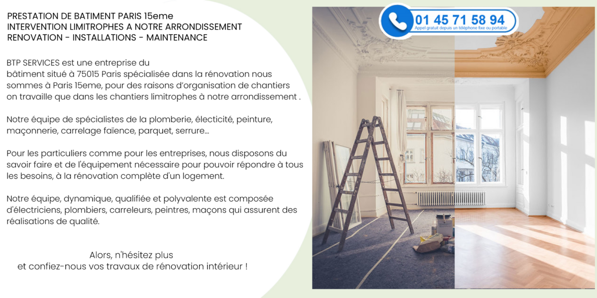 situé à 75015 Paris spécialisée dans la rénovation nous sommes à Paris 15eme, pour des raisons d’organisation de chantiers on travaille que dans les quartiers limitrophes à notre arrondissement .