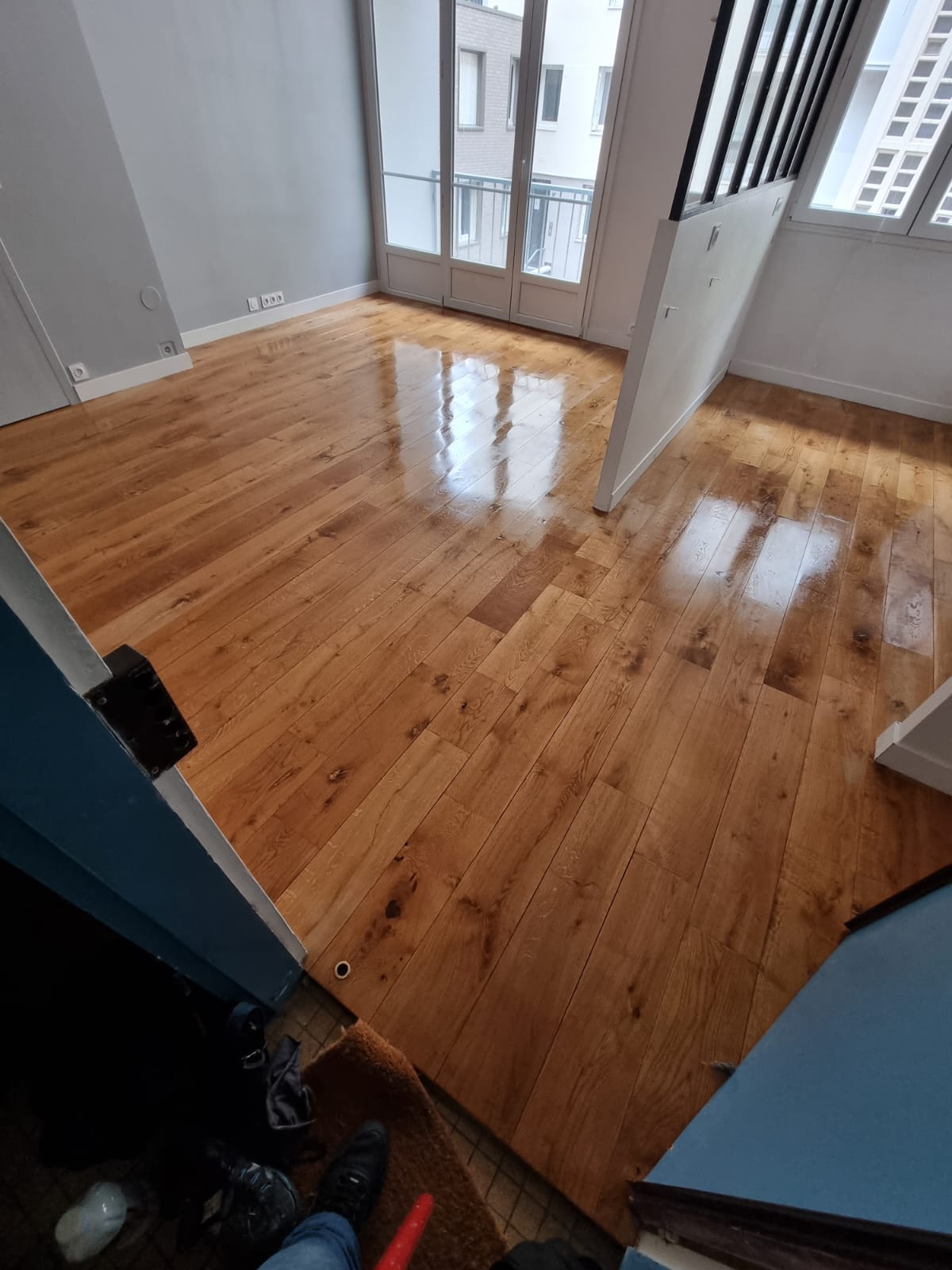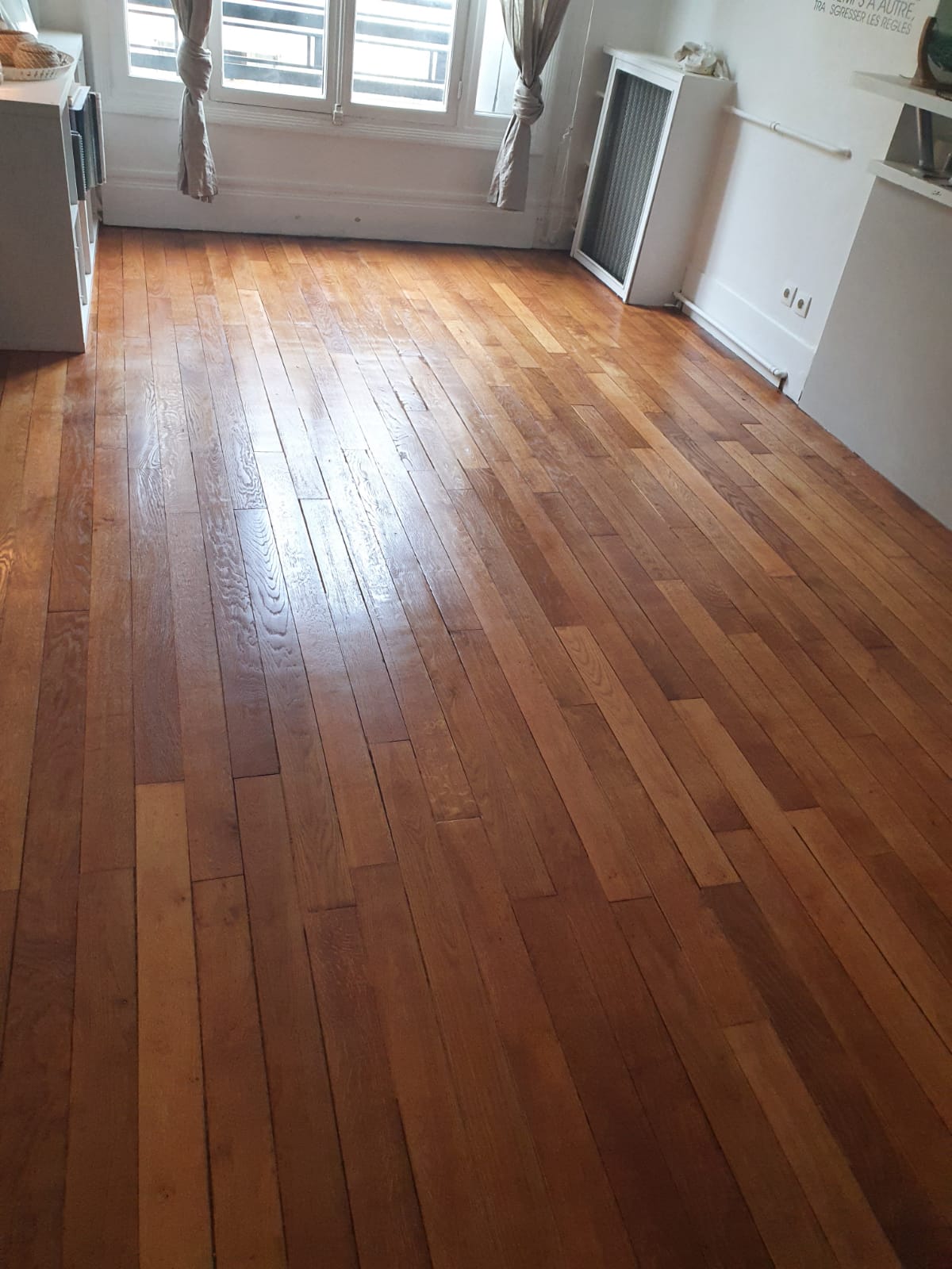 Poncage parquet , deux couches de vernis a l'eau avec egrenage entre les couches de vernis et deplacement de meubles a Paris 75015 , Budget 2000 euros